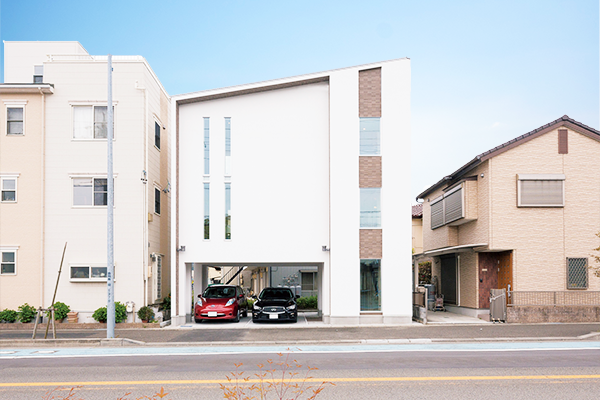 18坪(幅10m×奥行6m)の土地になんと3階建ての5LDK+ビルトインガレージが2台、この建物の中心は2階LDKのセンターキッチン皆が集まり楽しく会食も出来ます。3階には主寝室とワークスペースを配置して屋根裏のスペースまで無駄なく使いきるロフトもあります。敷地面積を感じさせない夢の詰まった間取りが出来ました。