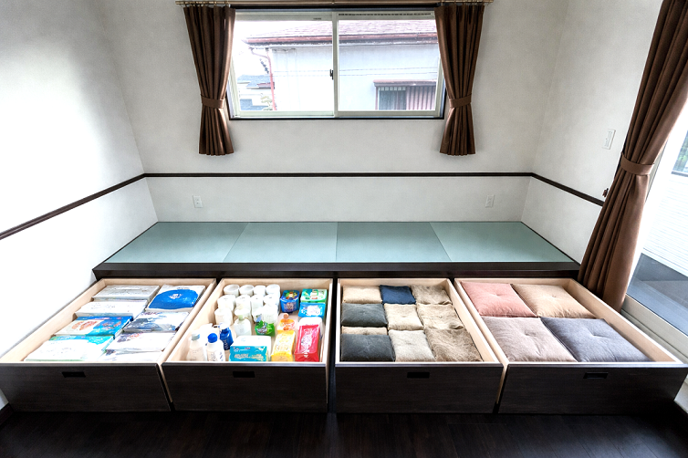 床やキッチンそして配置した家具も合わせて重厚な感じに仕上がりました。小上がりタタミコーナーの収納は片付け楽々な素敵なアイディア!