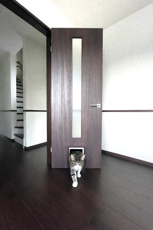 室内はオープンなつくりのLDKに猫ちゃん用の通り抜けドアをセレクトして、いつでも人と猫が触れ合う空間に、カラーはダーク系のブラウンを