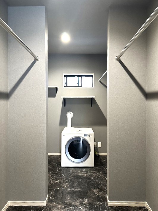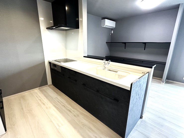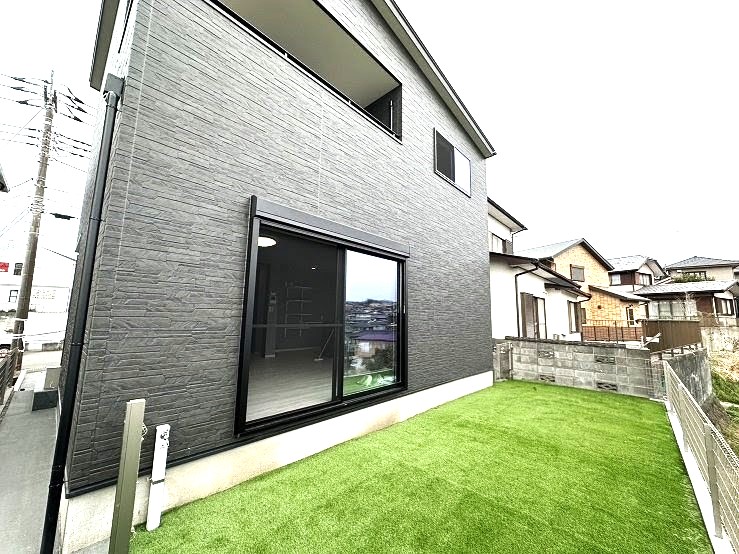 外観はブラック、室内はグレーを中心にカラーコーディネートしました。そして奥様のこだわりが家事が楽になる動線と機能。ランドリールームにはガス乾燥機を設置して洗濯物が乾いたらそのまま洋服が掛けらるようにハンガーパイプをつけてファミリークローゼットも併設、キッチン周りには棚を充実させて片付けも楽々です。そして緑がきれいな人工芝のスペースは愛犬用のドッグラン。毎日が楽で楽しいマイホームが完成しました。