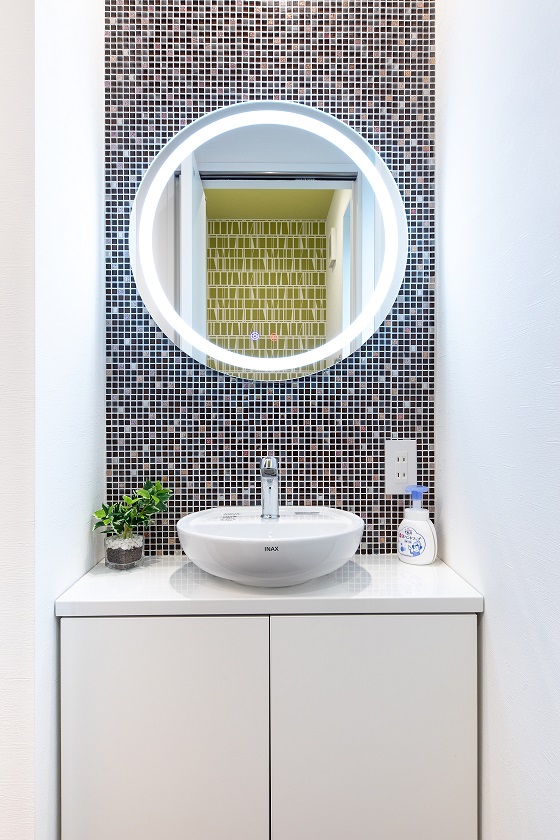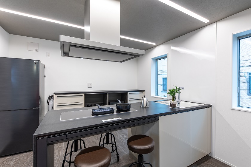 1階はコンパクトカー限定ながらビルトインガレージと玄関、洗面、浴室を配置、2階はPanasonic囲炉裏キッチンでダイニングテーブルを兼用し