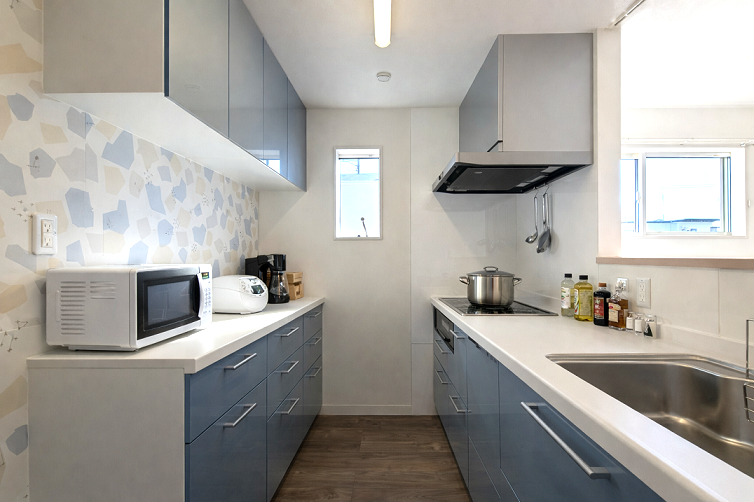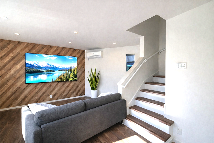 室内もしっかり充実の広々リビング、配色はホワイトに木目で差し色には外観と同じく水色をいれて