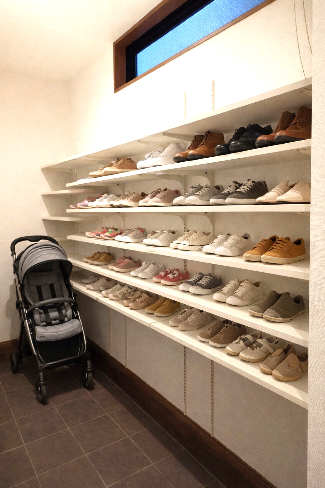 大容量の玄関のシューズクロークは可動式で高さ調整も自由自在。