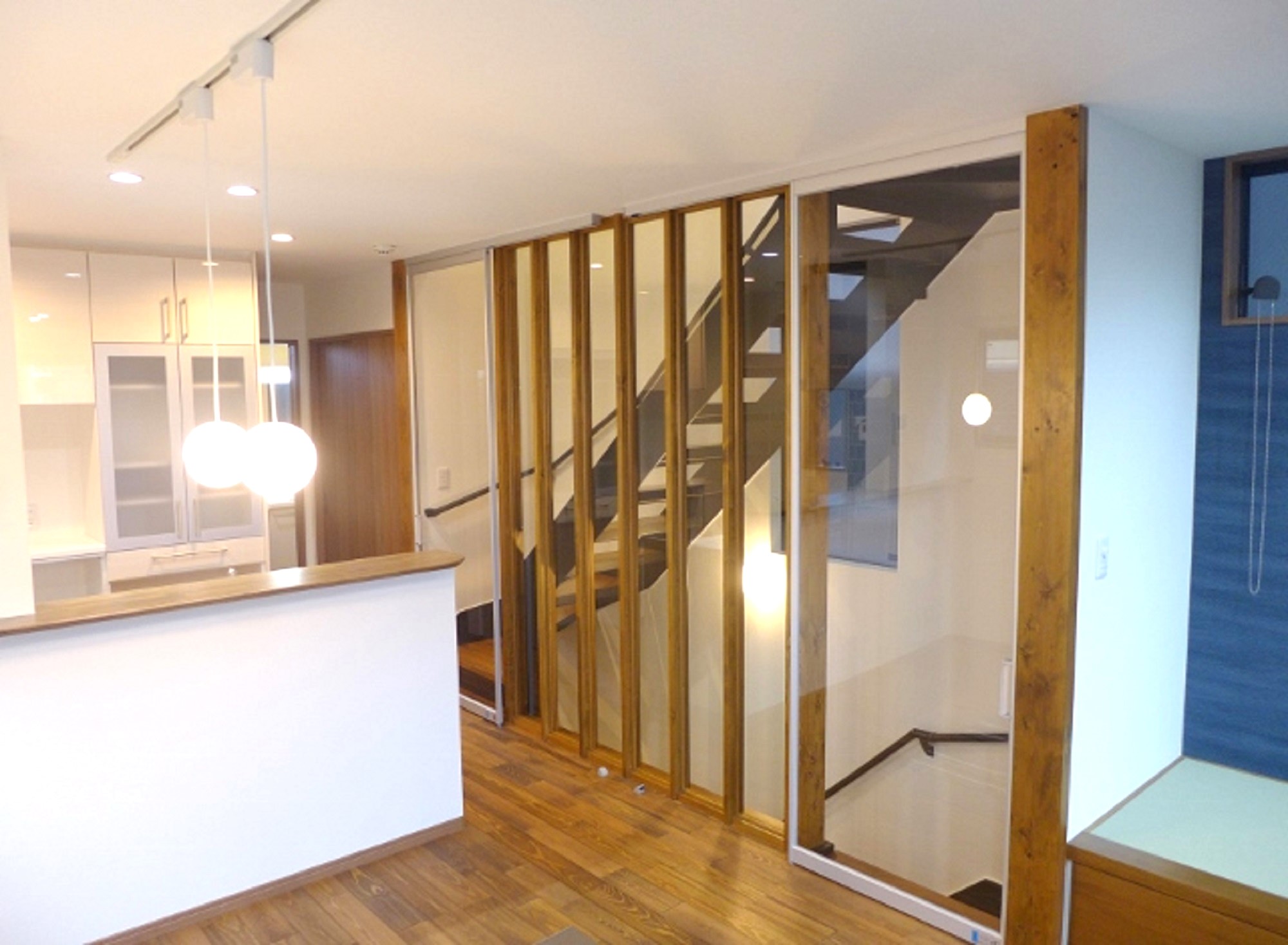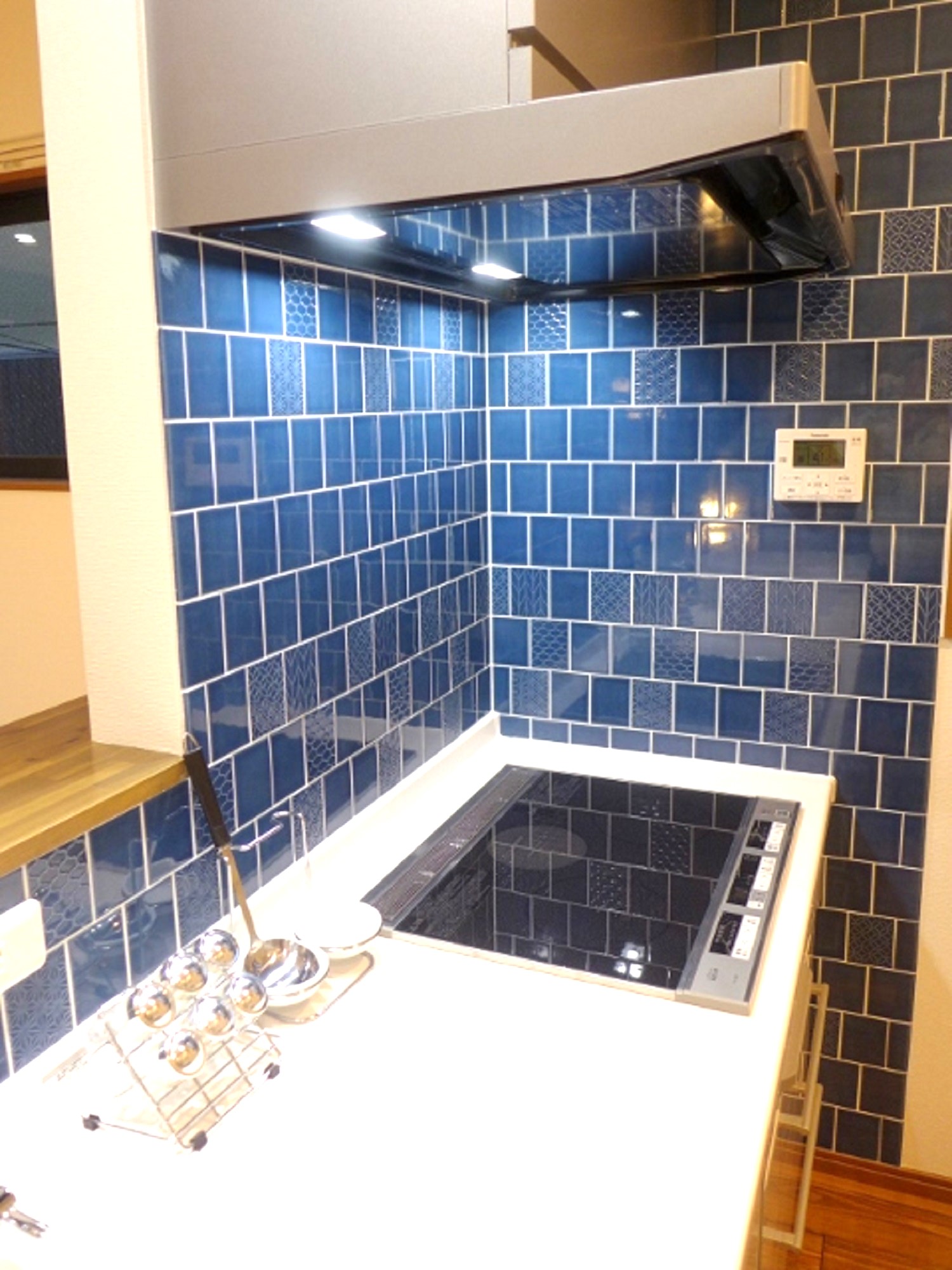 2階のLDKはネイビーの壁紙とモザイクタイルで落ち着いた空間に!