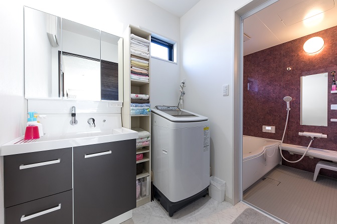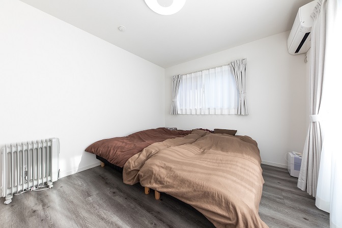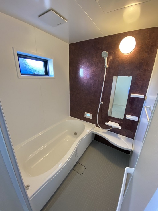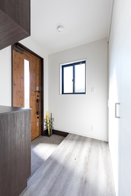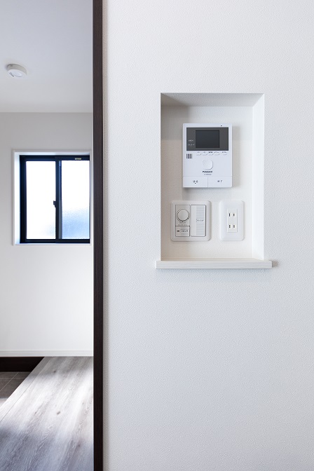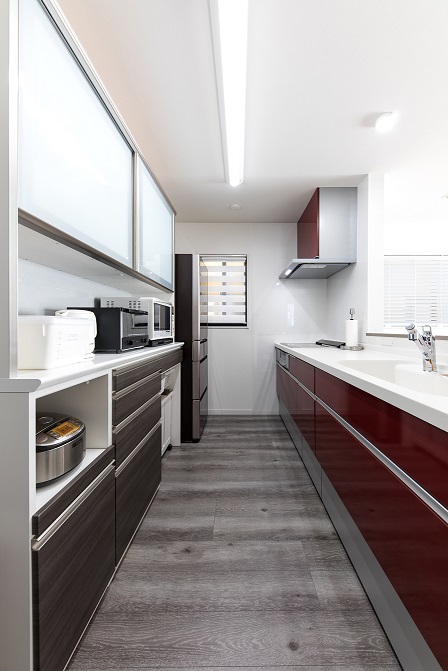 内部はアッシュカラーの床にホワイト一色の壁紙、キッチンや浴室の壁にレッドを加え