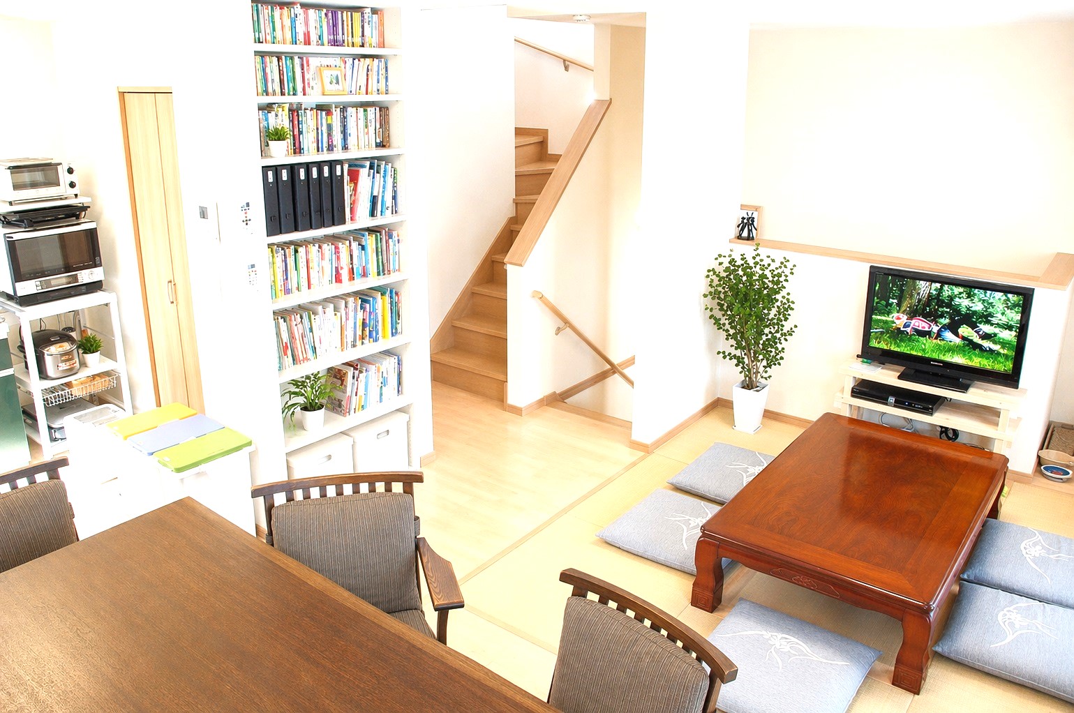 室内はリビングを中心に各階へつながる動線で自然と会話も増えます。さらにソファーではなく掘りごたつを採用したことで家族の距離感が縮まります(^^♪