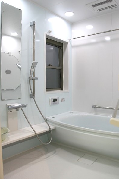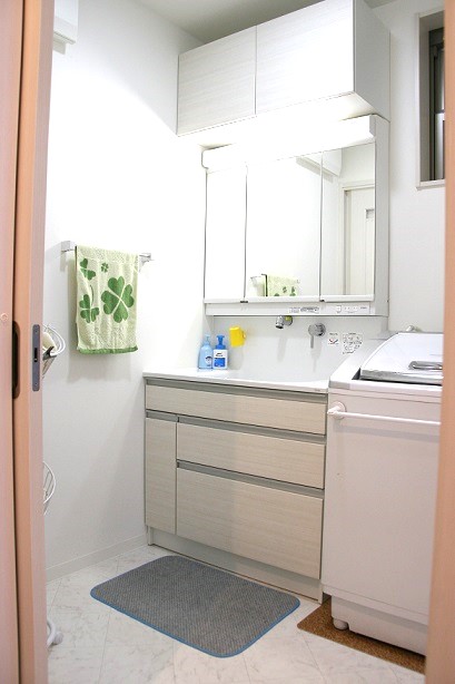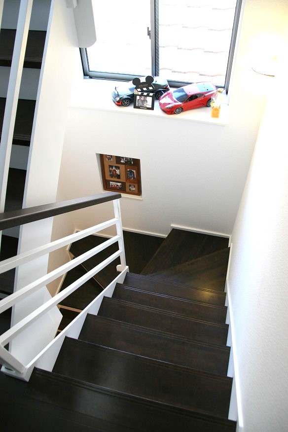 ホワイトの鉄骨とダークブラウンの木の組み合わせの階段がさらに高級感を演出します。水回り設備や空間は全てホワイトで清潔感を出しました。