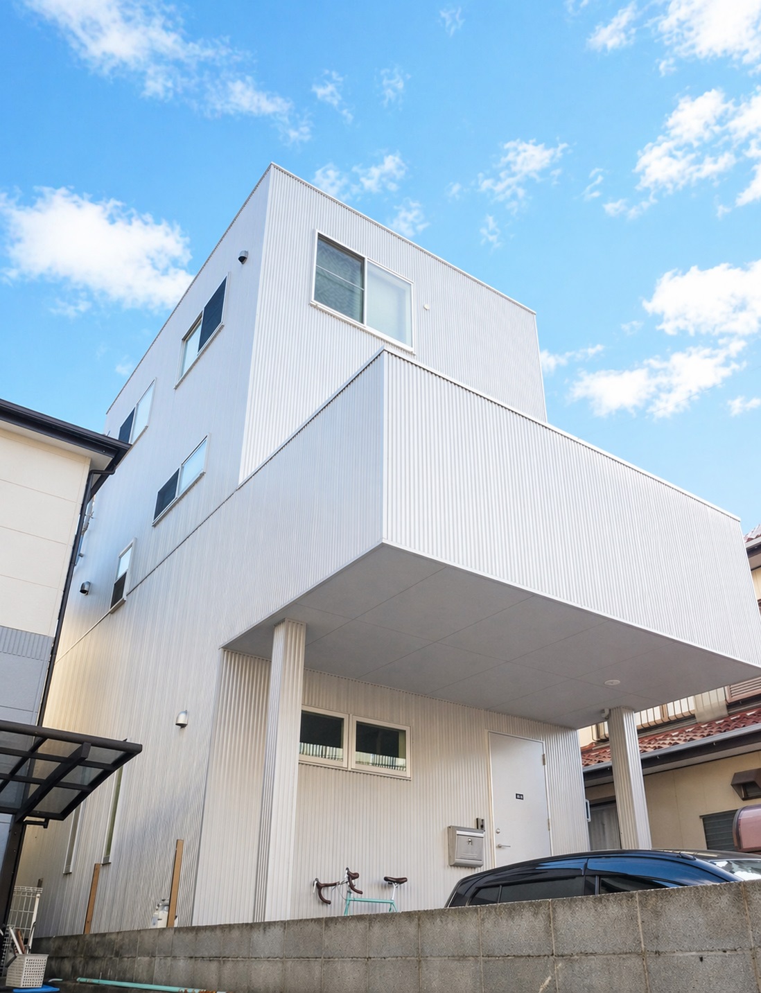 シルバーのガルバリウムで仕上げた外観は、無機質ながら清潔感を感じます!