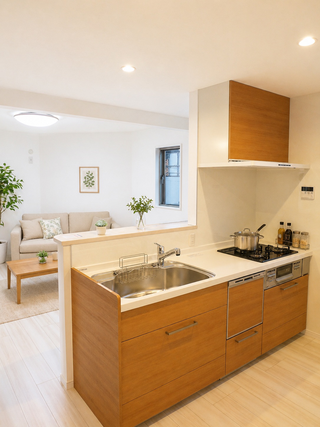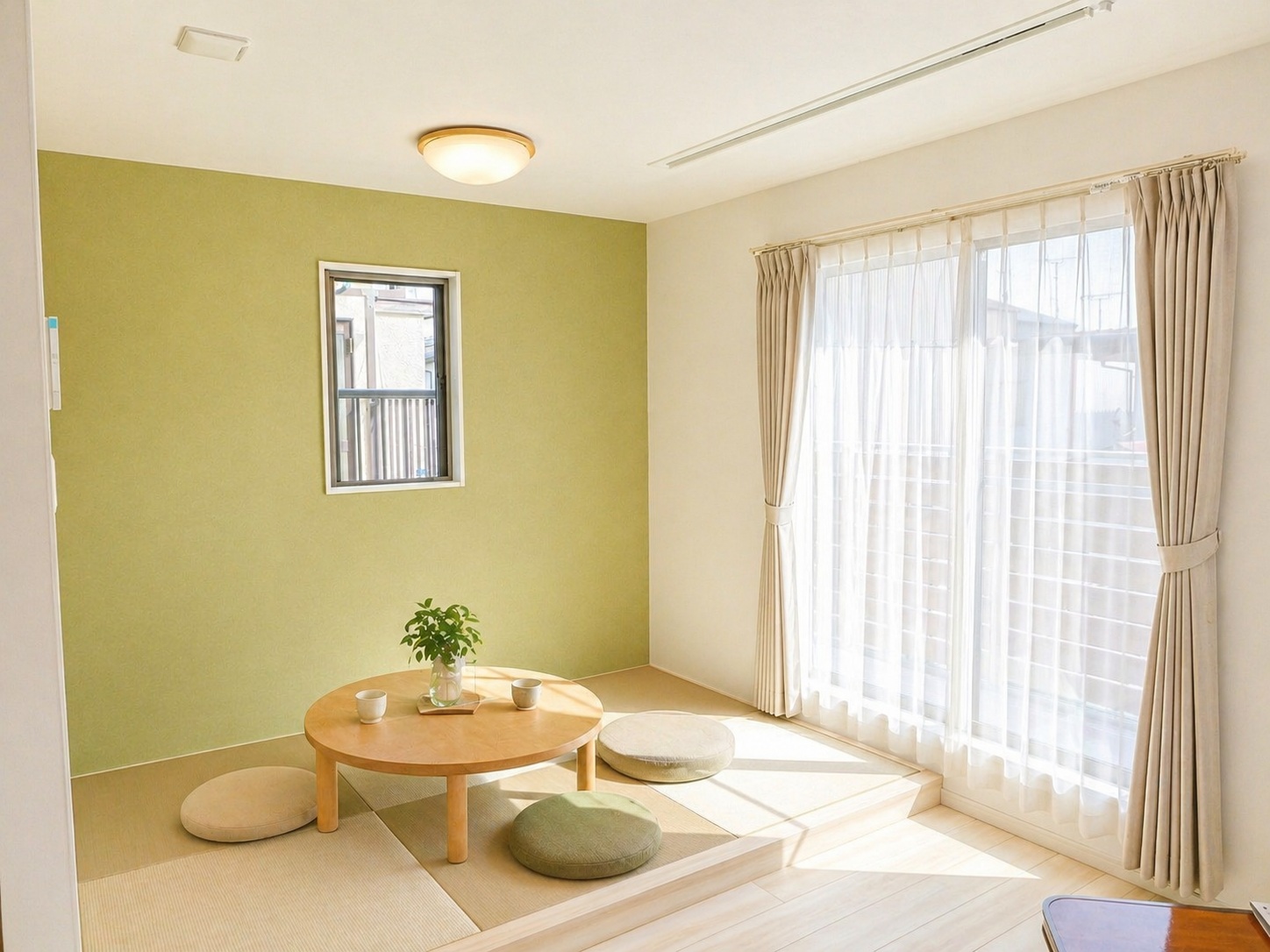 リビングの一角に畳コーナーを配置、お子様の遊びスペースや少し疲れた時にゴロゴロするのもいいですね(^^♪