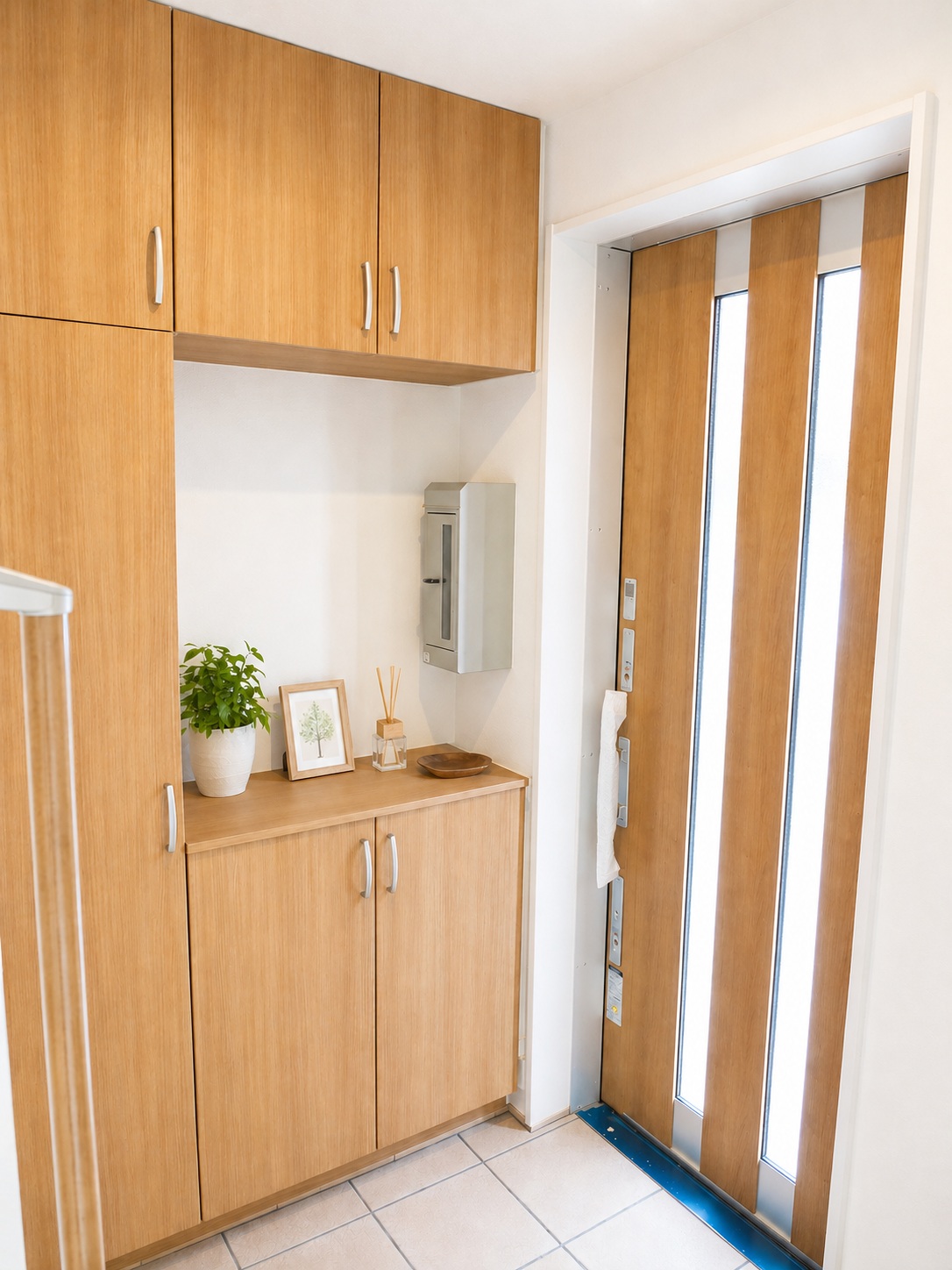 駐車スペースは15坪の土地を感じさせない工夫でビルトインガレージを採用、普通車もばっちり駐車可能です。