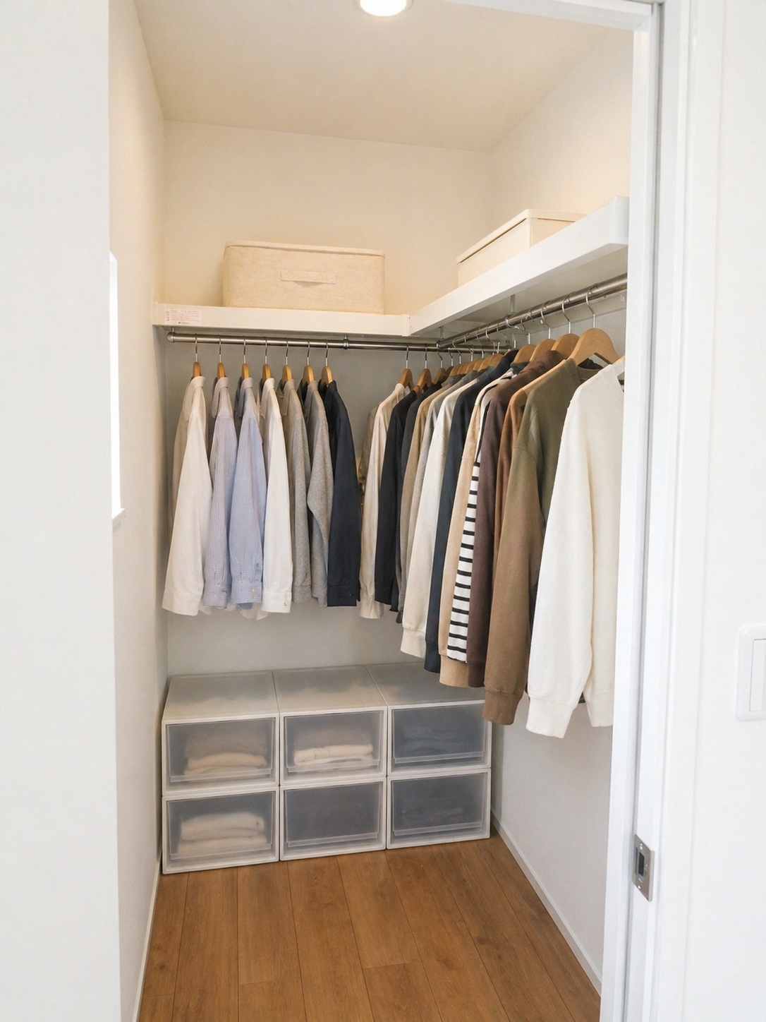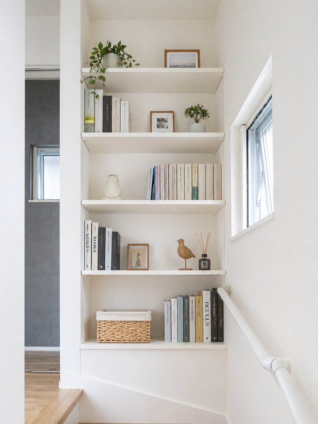 収納のウォークインクローゼットは収納力抜群、階段の壁も無駄にはせずに本や小物の棚を作りました。