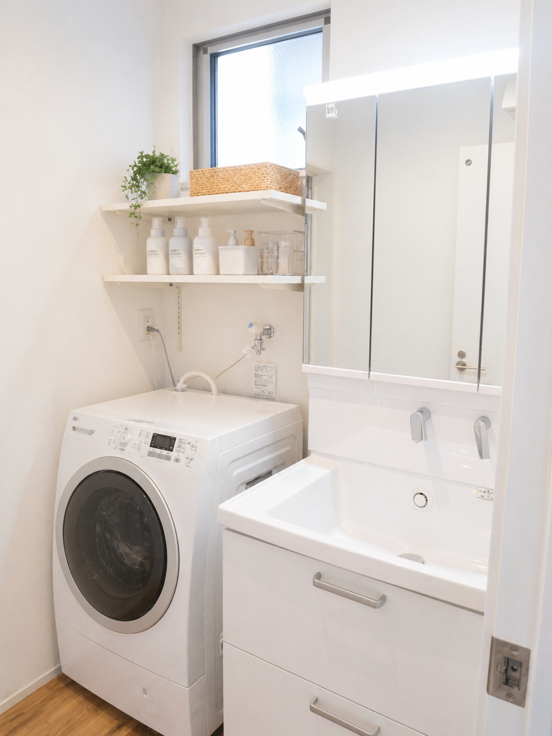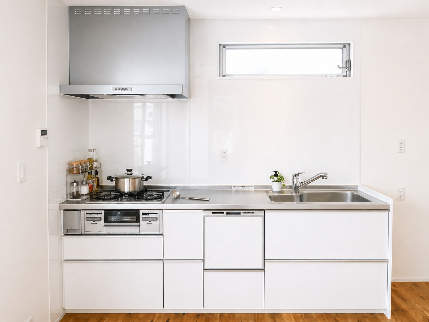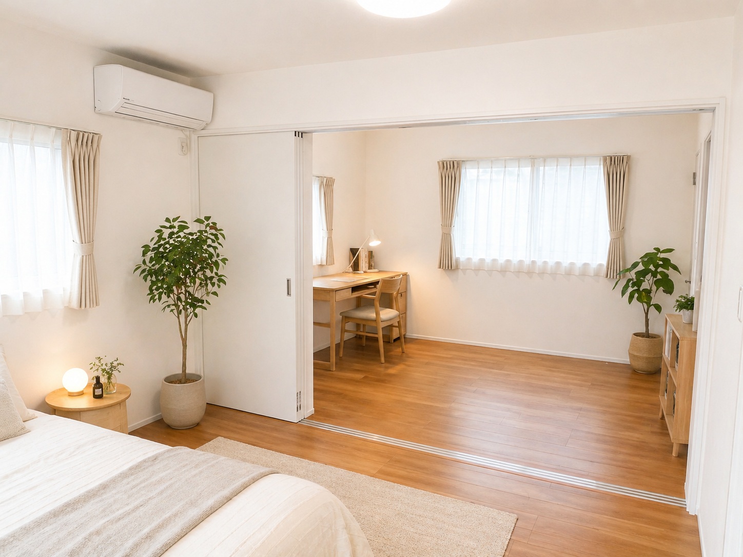 室内も外観同様にホワイトを中心とした配色で清潔感たっぷり、寝室は壁で仕切らず引き込み式の建具にしてシーンに合わせて使い分けます。