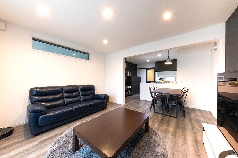 いつでも玄関はすっきり、リビングルームは落ち着いたアッシュテイストの床材にホワイトの壁紙で落ち着きを感じます。