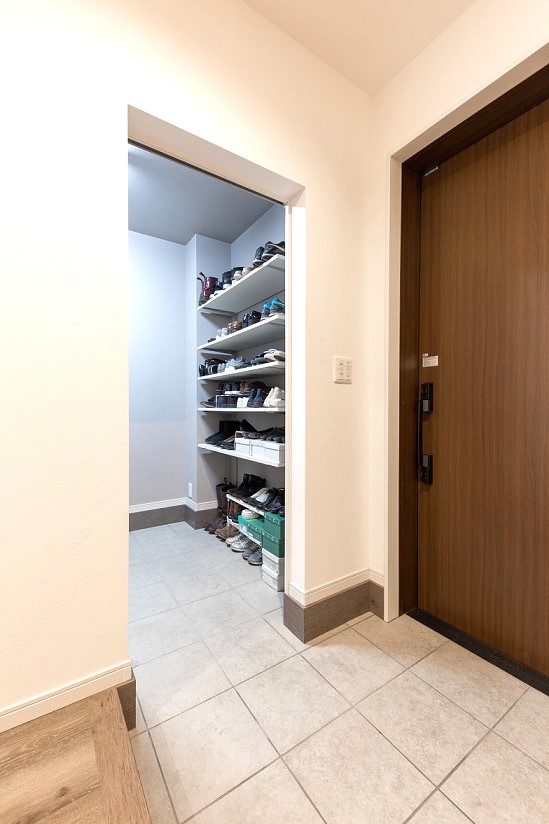 玄関を入るとそこには、靴やゴルフバッグやDIY工具などたっぷりしまえる大空間のシューズインクローゼットを配置して