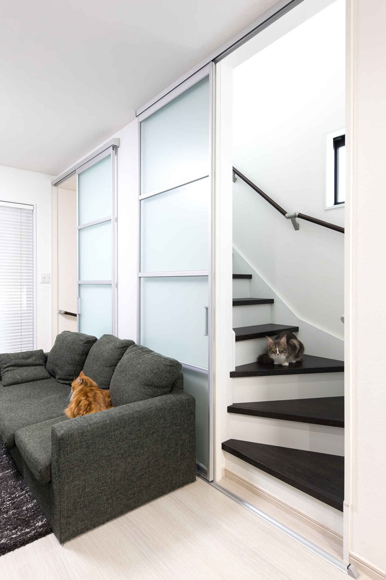 狭小地特有の室内の明るさを確保するのが難しい問題については、階段にも大きな窓を設置して、光の入りやすいスクリーンパーテーションを使い明るさを確保しました!