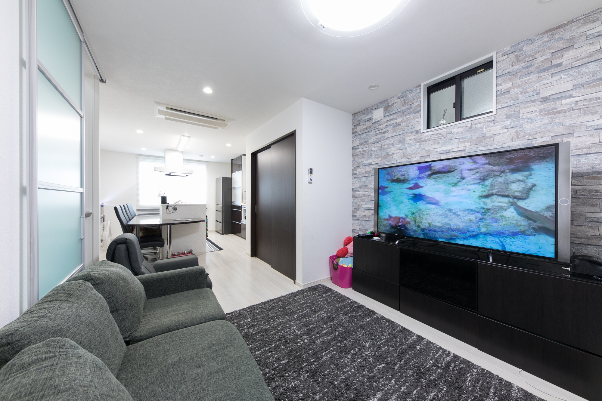 間取りは、いつでも皆が集まってワイワイ出来るカウンターキッチンを採用、更に人が増えても広くつながりのあるリビングルームが一体感を感じます。