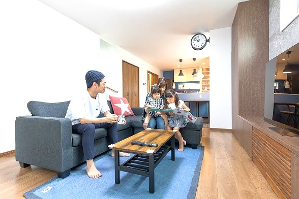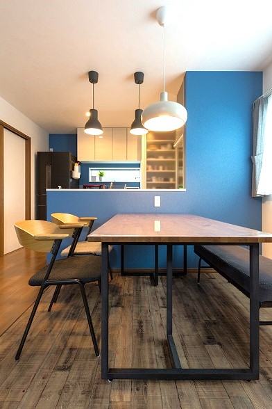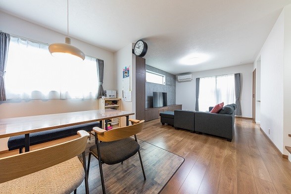 オンリーワンの組み合わせ仕上がり一度見ると住む方のセンスを感じますね!さらにご自身たちでセレクトした壁付けの時計や家具の一つ一つが建物とマッチしていて