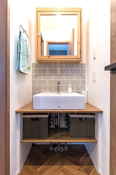トータル的に楽しめている感じが伝わります。小屋裏スペースは書斎の空間として利用、洗面化粧台の造作はかわいいだけじゃない使い勝手も考慮した優れもの、