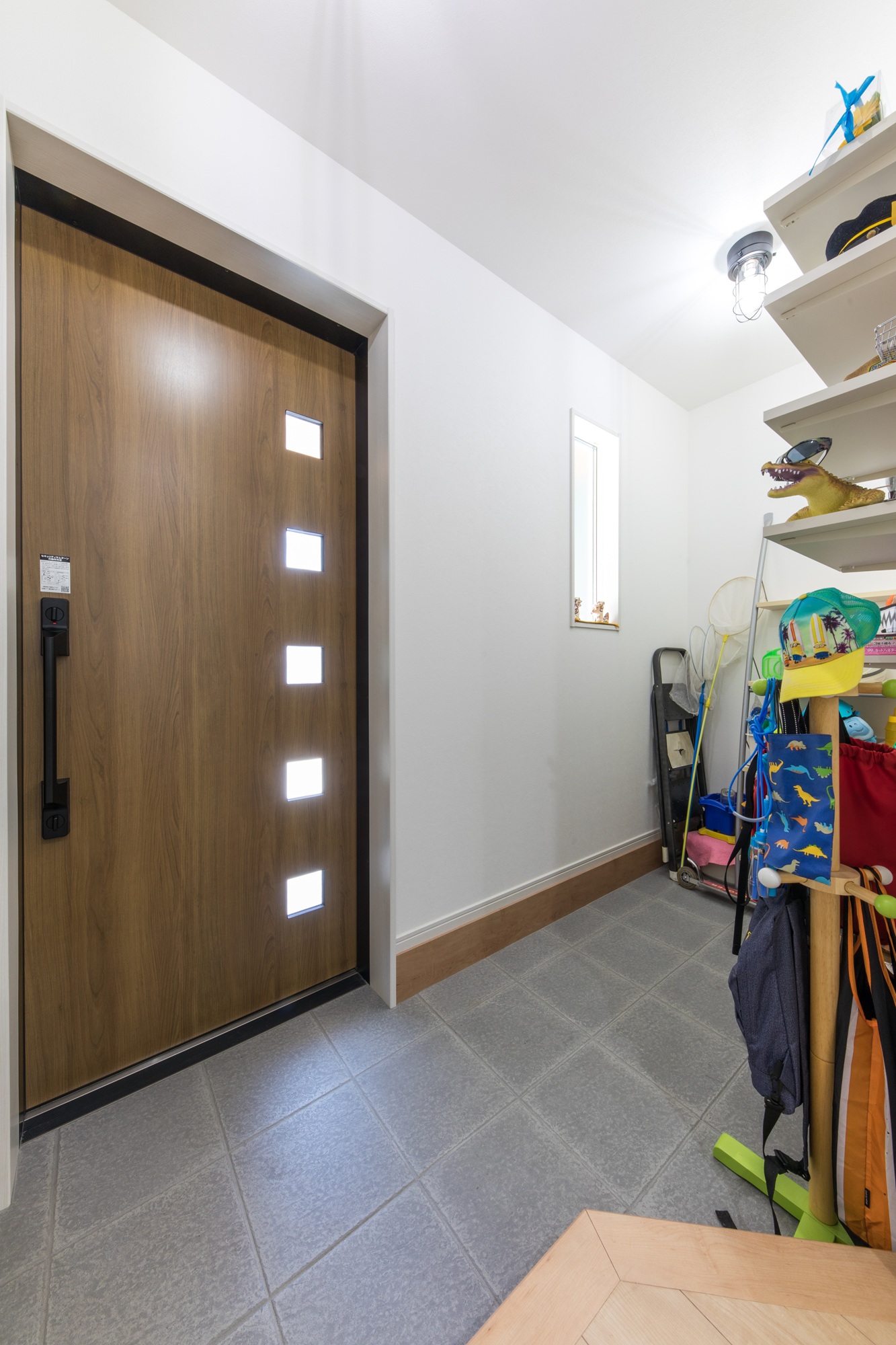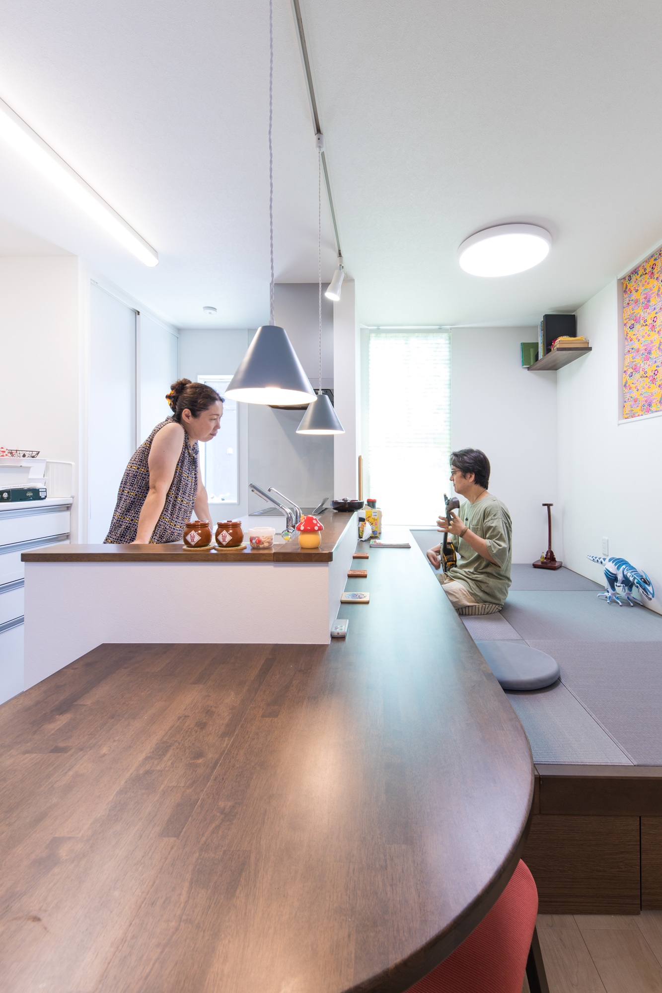 玄関ホールの土間は通常の倍の広さ。レジャー用品の収納だけでなく自転車の出し入れも可能に!2階LDKは対面カウンターと畳コーナーを融合させた居酒屋スタイル。