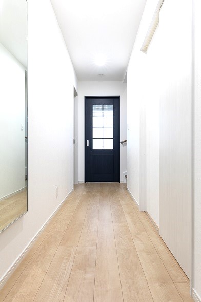 玄関は土間を広く取り狭小住宅を感じさせない見た目を演出しながらあえて仕切ることなく見せる収納として実用性を優先!