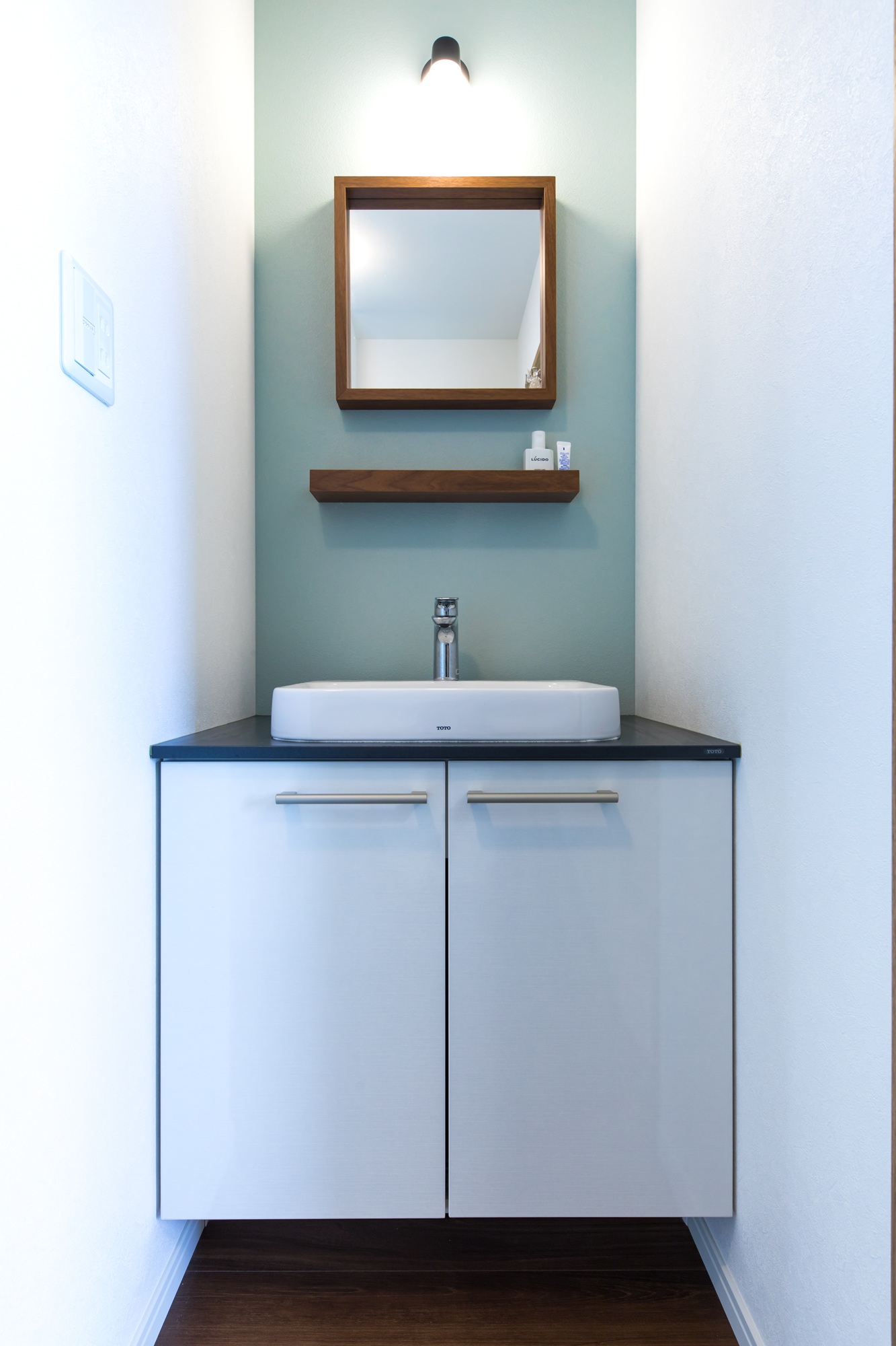 駐車スペースの奥、濃いめのグリーンと木目(軒天井)のコントラストのフォルムが印象的。