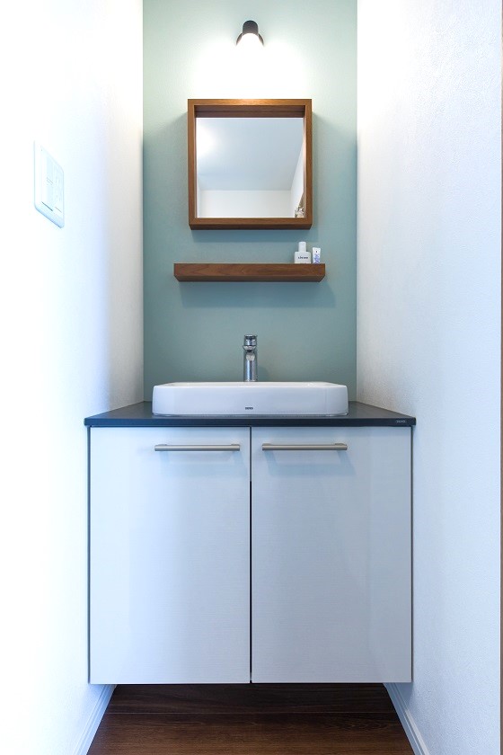 土地の幅4.8mに建つ緑色と茶色の自然な配色が和みを演出する家