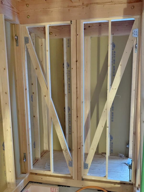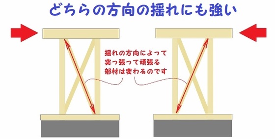 壁が2カ所並んでいる場合は、それぞれ筋交いの向きを変える事で