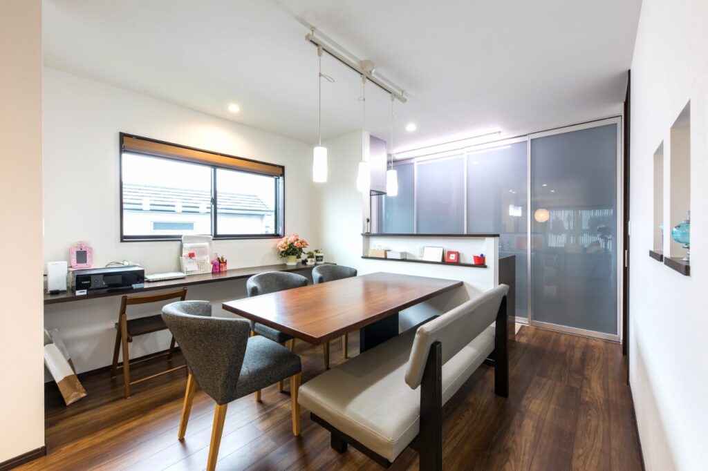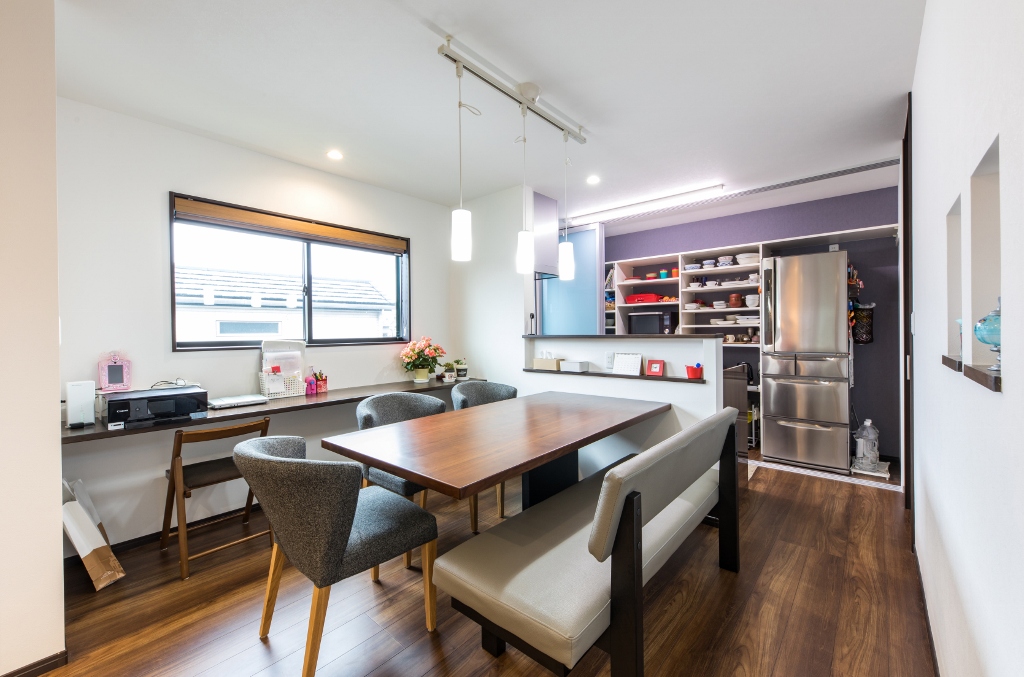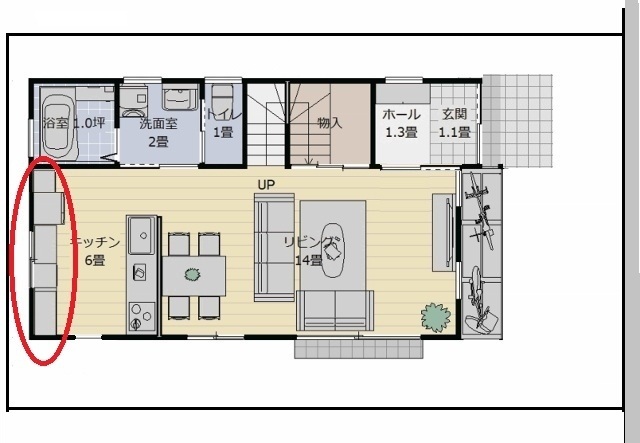 対面キッチンにした時、背中側に食器棚や冷蔵庫や電子レンジがあると便利です。
