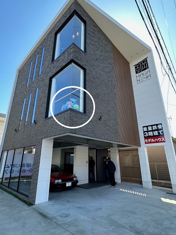 大きな窓にモンスターズインクのキャラクターを飾って注目度UPを試みています。