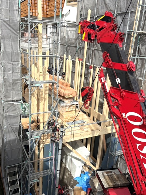 柱や梁が次々に運ばれ、大工さんが組み立てています。