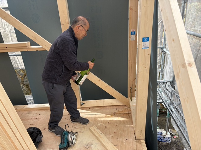 S様には、建物の四隅をお神酒で清めていただきました。