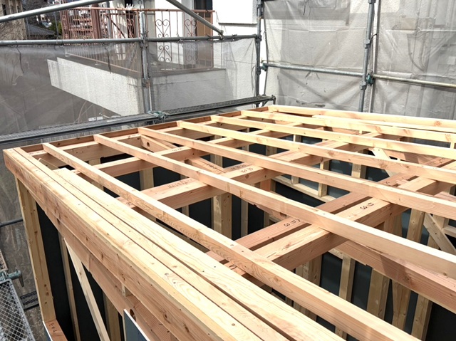 1階2階、屋根の骨組みまで進みました。