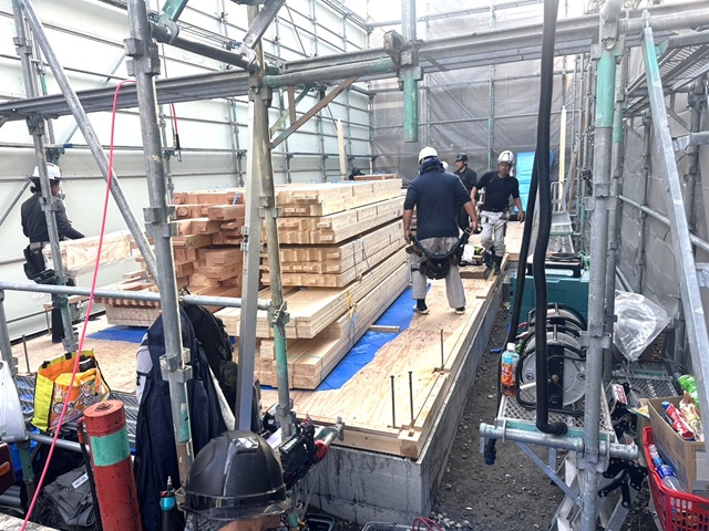 既にたくさんの木材が置かれていますが、まずは柱を建て梁を組み、