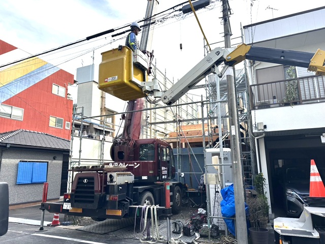 材料は、工程に合わせて当日運ばれてくるトラックからクレーンで下ろされます。
