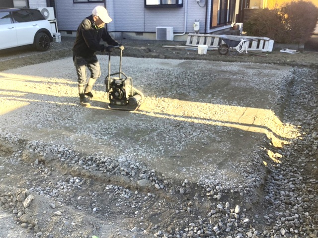 砕石を敷いて、ランマーで転圧して固めています。