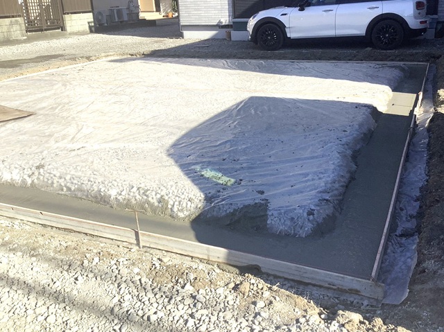 全体をシートで覆い、外周のくぼんだところに捨てコンを打ちました。