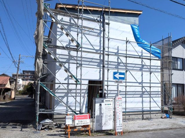 上棟後のS様邸。外周に透湿シートを貼りました。