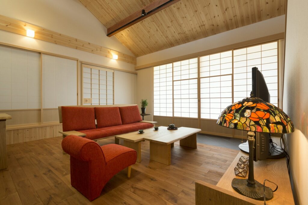 天然木材に囲まれた避暑地のロッジに居る感覚。