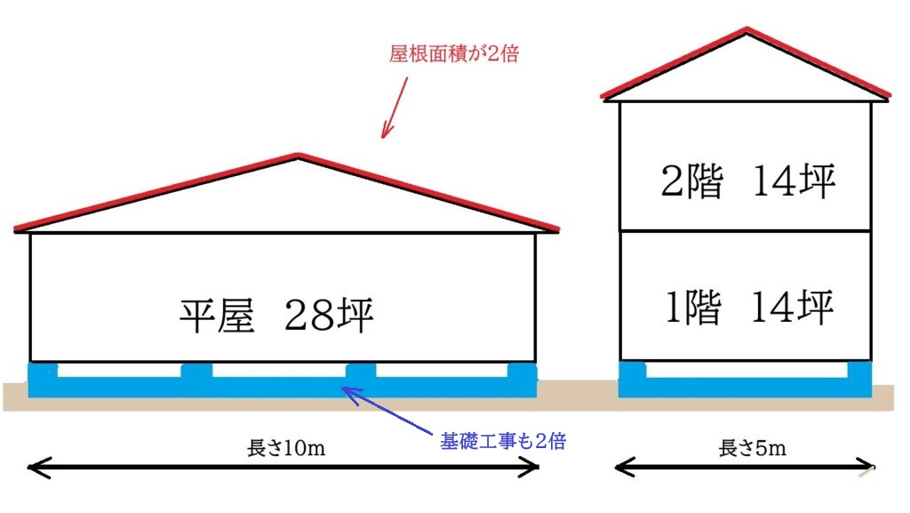 同じ床面積(28坪)の住宅で平屋と2階建の比較