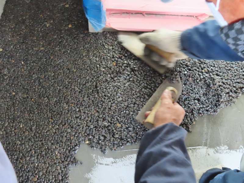 敷き詰めた砂利にモルタルを流し込んで一旦カチカチに硬化させます