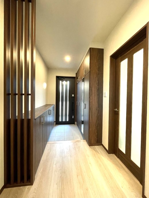 基本的にはすべて別の完全二世帯住宅ですが玄関はスペースがもったいないので共有にして、シューズBOXは大容量にしました。床材や壁紙は白を基調として広さを感じる雰囲気にしました。以前の家は日が入りにくく暗かったので、母の希望通り南向きにLDKを配置してたっぷり光が入る設計にしました(^^)/
