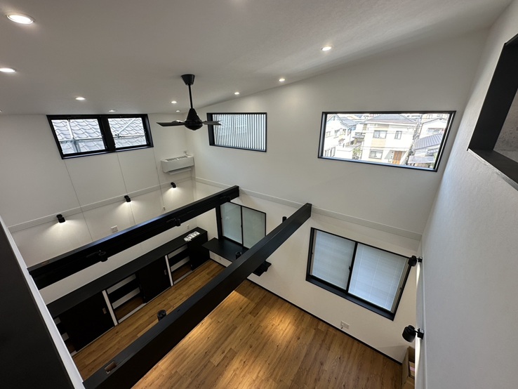 会社の成長と共にスタッフの人数も増え事務所が手狭に感じて新事務所を建築する決意をしました。土地が希望していた場所に見つかったので事務所や店舗などの実績のある建築会社をさがしたところちょうど私が考えていた事務所の雰囲気に近い建物画像が建築システムさんの本社だったのでお声がけさせてもらいました。最初は同じく鉄骨で検討しておりましたが建築システムさんの方から木造でもご希望の事務所は出来そうでコストも軽減できますとご提案いただき木造で建築することに決めました。こだわりのポイントは大きな吹抜けそこに見える梁、ちょっとしたミーティングが出来るカウンターコーナー、各業者さんが集まれる広い打合せ室、そして1階の車庫には電気自動車の充電所と仕事の資材も置けるようにしました。新事務所を建てるならこんなイメージにしたいなと思っていたことは概ね形に出来ました。私もスタッフの皆も毎日気持ちよく仕事が出来るようになりました。