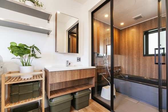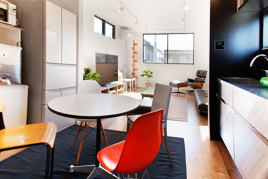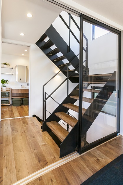 外観はブラックのガルバリウムでモダンに仕上げ、室内の階段を鉄骨階段でスケルトンにしてデザイン性を優先し空間を広く見せる工夫もしました。無機質なオールステンレスのキッチンや原色の家具を配置して、そこに木目を合わせることでビンテージの雰囲気を作りました。仕上がった家は、すごく気に入っているのと、これからも観賞用の植物やインテリアを足していくのが楽しみです♪